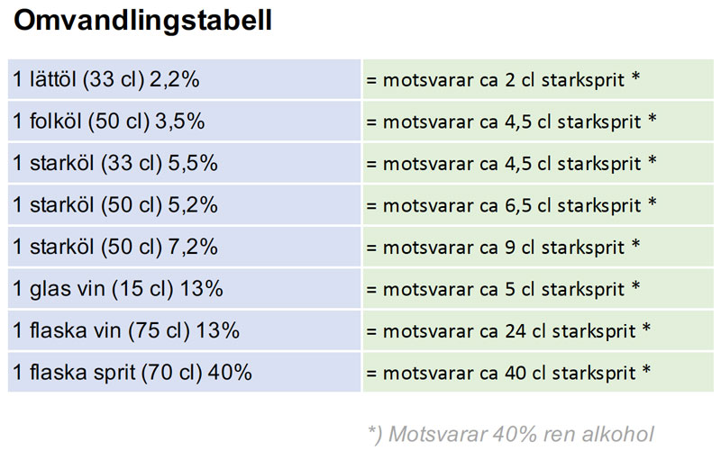 För att få ett gemensamt konsumtionsmått används begreppet standardglas. Ett standardglas alkohol innehåller 12 gram alkohol, det motsvarar: